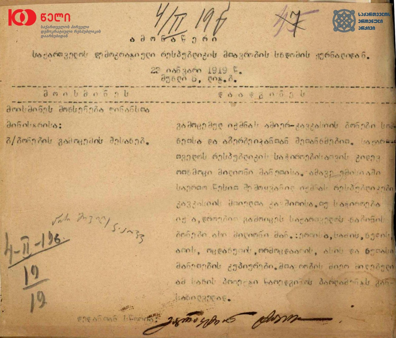 გალაკტიონ ტაბიძე თავისი ხელმოწერით ამოწმებს საქართველოს დემოკრატიული რესპუბლიკის მთავრობის სხდომის ჟურნალიდან ამიერკავკასიის ბონების გამოცემის შესახებ ამონაწერს. 1919 წლის 23 იანვარი.